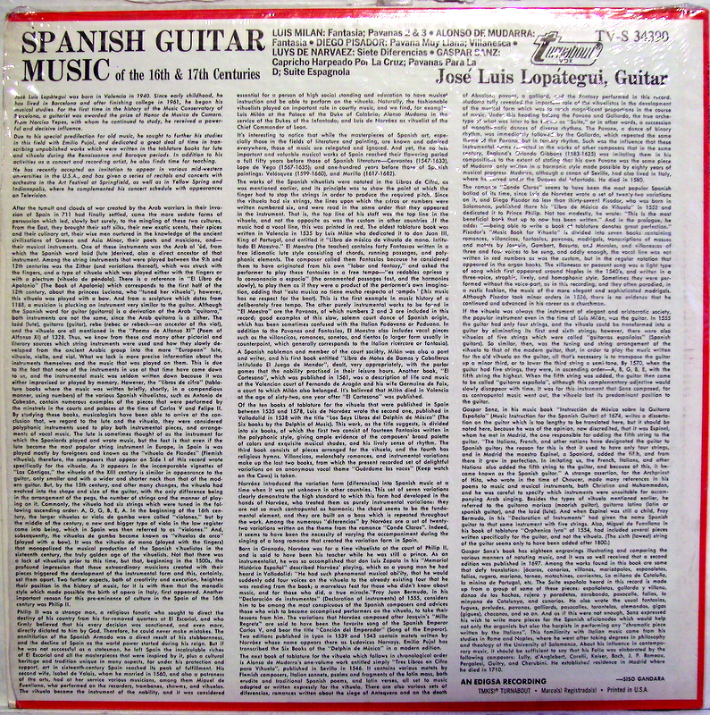 Turnabout TV-S 34390 – José Luis Lopátegui – Spanish Guitar Music Of The 16th & 17th Centuries (Works By Luis Milan, Alonso De Mudarra, Diego Pisador, Luys De Narvaez, Gaspar Sanz)